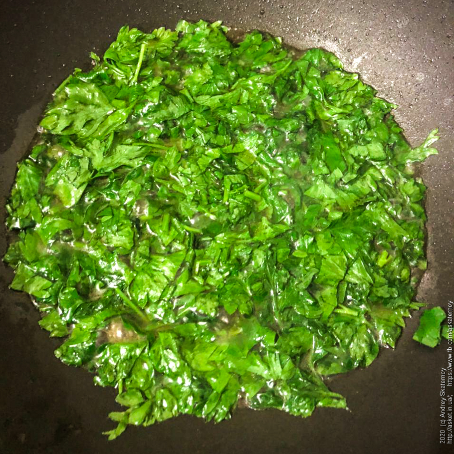 Тем временем в замке… в сковороду с высокими стенками наливаем чуть растительного масла – для начала. В него – свежепорубленной петрушки.