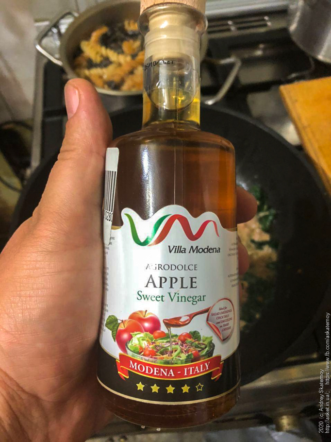 Винный яблочный уксус из Модены. Неравнодушен я к этому городу, но вот честно – все на чем написано его название – это всегда очень вкусно. Это ведь Эмилия-Романия – одно из самых вкусных мест на земле и родина многих известных продуктов типа Пармезано Реджано, мортаделлы, соуса болоньез и так далее. И этот вот уксус хранится долго и его никто не выпьет. Чуть брызгаем уксусом. Но чего-то нехватает. Смотрим на предыдущее фото… это же очевидно! Любой фотограф скажет – нехватает красного.